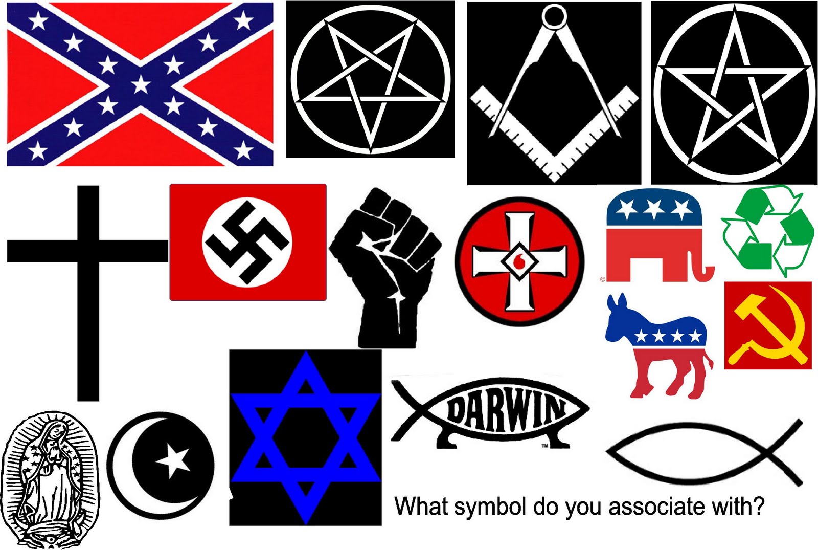 I was sitting in my U.S. History class watching a documentary about the Freedom Riders (if you do not know who they were I suggest you look it up) and the sight of the Confederate flag roused my distaste for what that flag represented. It also reminded me of the disdain I sometimes have towards individuals in this state who wave around that flag proudly as if they had something to do with the history of it. That flag to me represents a bigoted, oppressive Southern mindset that held people in bondage for generations and the fact people still are proud of that history disturbs me. The point being, each symbol represents something. Businesses use logos to distinguish a product to the masses and we the people enjoy representing those emblems all over our clothes, cars, etc... In essence, there is nothing wrong with this but what one should take in consideration is the fact that the symbols one wears or advertises, identifies them with that ideology, company or philosophy- conscious of it or not.